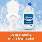 Amazon Basics Toilet Bowl Cleaner with Cling Action Bleach, Fresh Scent, 24 Fl Oz (710 mL), 2-Pack. Powerful bleach formula clings to toilet bowl surface providing a deep clean as it deodorizes. Removes tough stains and grime leaving behind a fresh clean scent and squeaky-clean surface. Angled neck on squeeze applicator bottle easily reaches under bowl rim for a complete clean. Safe for all types of plumbing and septic tanks. DIRECTIONS FOR USE: Pinch each side of child resistant cap and turn counterclockwise. Flush toilet and raise seat. Apply carefully by pointing top of bottle down into bowl. Squeeze at least 4-ounces of product on all interior bowl surfaces, including under the rim. Let stand for at least 10 minutes then brush entire bowl and flush. ***Please Note: Cling-Action bleach is not formulated to be a thick gel…this is a medium viscosity product which clings effectively to bowl surfaces to provide a deep cleaning. Satisfaction Guarantee: We’re proud of our products. If you aren’t satisfied, we’ll refund you for any reason within a year of purchase.