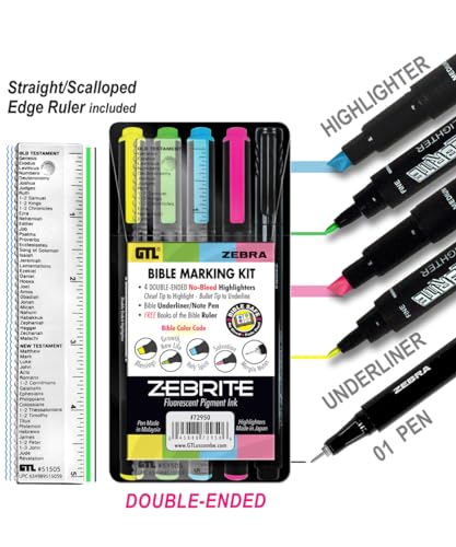 G.T. Luscombe Company, Inc. Zebrite Bible Marking Kit | No Bleed Pigmented Ink | No Fading or Smearing | Double Ended Highlighters, Note Pen & Books of the Bible Ruler/Bookmark (Set of 5 + Ruler)